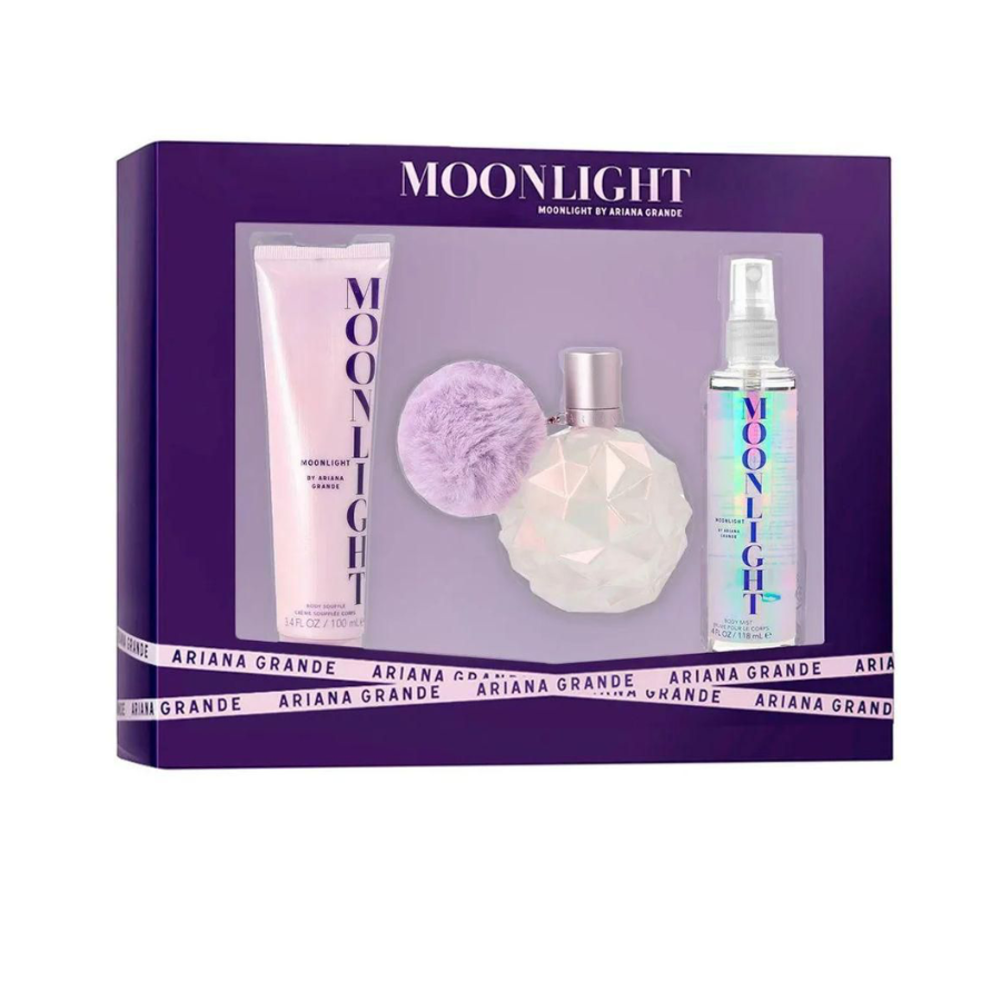 1 Perfume Edp 3.4 oz + 1 Body Mist 4.0 fl oz + 1 Body Souffle 3.4 oz Moonlight de Ariana Grande es una fragancia de la familia olfativa Floral Frutal para Mujeres.