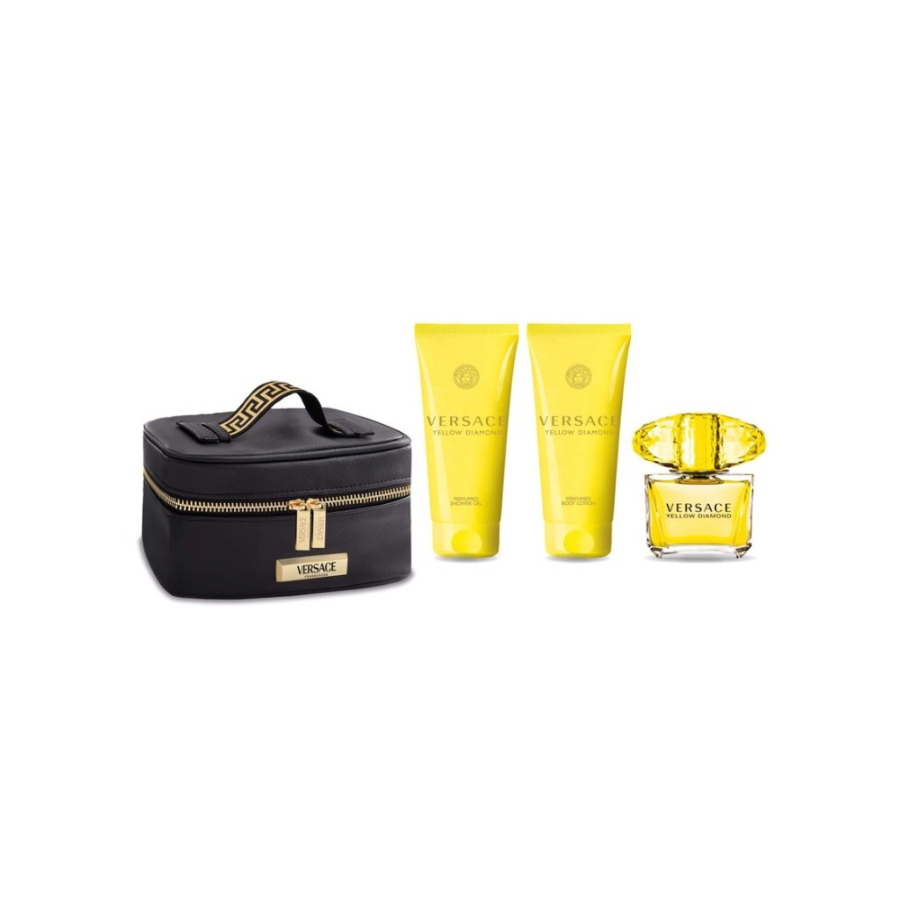 Versace Yellow Diamond Eau de Toilette 3.4oz  Set para Mujer es una fragancia floral-afrutada que brilla como una joya en la piel. Con notas de bergamota, sorbete de pera y lirio de agua, envuelve con un aroma sensual y luminoso. El set incluye perfume, gel y loción corporal en un elegante neceser, perfecto para regalar o darte un capricho.